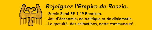 L'Empire de Reazie est un serveur Semi-RP / Survie. Vous pourrez y jouer librement dans une communauté accueillante. Venez fonder le plus grand royaume, ou vivre à la campagne ! Nous vous attendons ;)